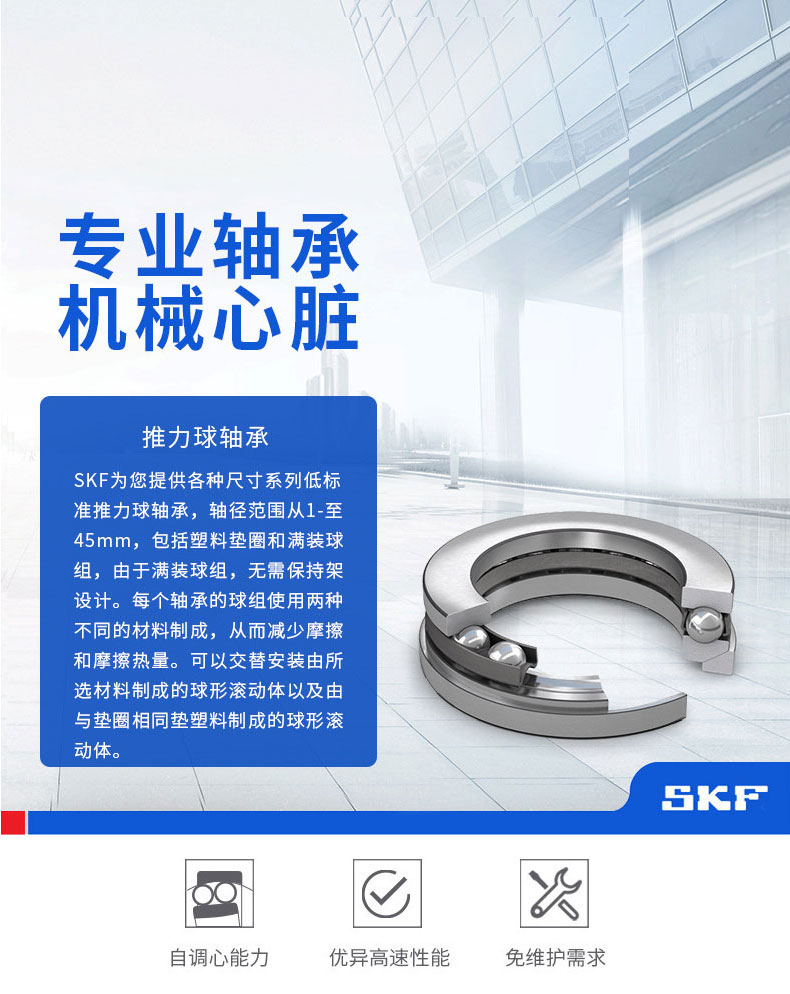 SKF的单向推力球轴承,可以承受单方向的轴向负荷,并能作单方向的轴向定位,但绝不能承受任何径向负荷。